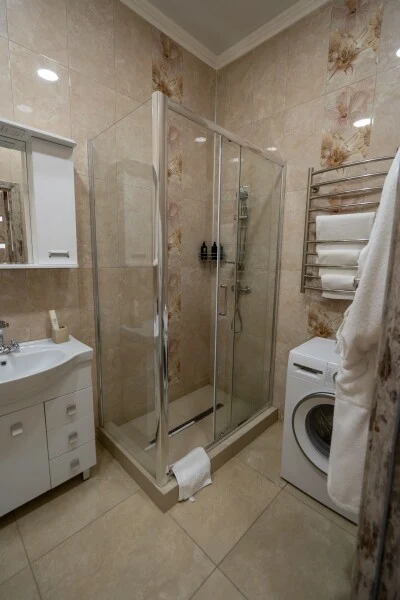 Двуспальная кровать и двуспальный диван - однокомнатный номер 52,8 кв.м. - личный сан.узел (душевая кабина, раковина, туалет, фен, полотенца для лица и тела, халаты, гигиенические принадлежности, стиральная машина, гладильная доска, утюг, сушилка) - кухня (чайник, микроволновка, плита, холодильник, раковина, посуда различного вида) - размещение до 2 человек