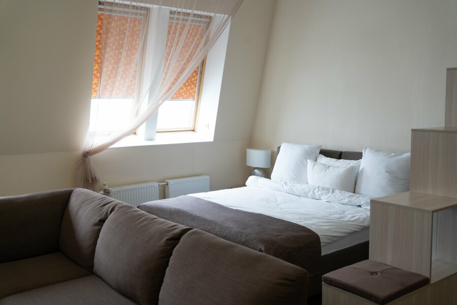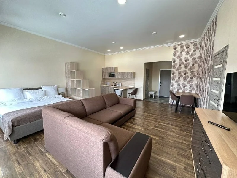 Двухспальная, двухъярусная кровать и диван -двухкомнатный номер с TV 53,2 кв.м -гостиная с кухней, двуспальная кровать и двуспальный диван -спальня с двухъярусной кроватью -личный сан.узел (душевая кабина, раковина, туалет, фен, полотенца для лица и тела, халаты, гигиенические принадлежности, стиральная машина, гладильная доска, утюг, сушилка) - Кухня -раковина, чайник, микроволновка, холодильник, стол, стулья, барная стойка, посуда различного вида -от 1 до 6 человек -дети до 5 лет - бесплатно