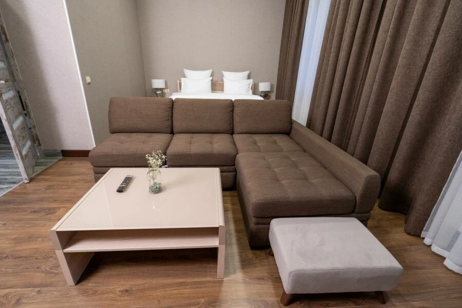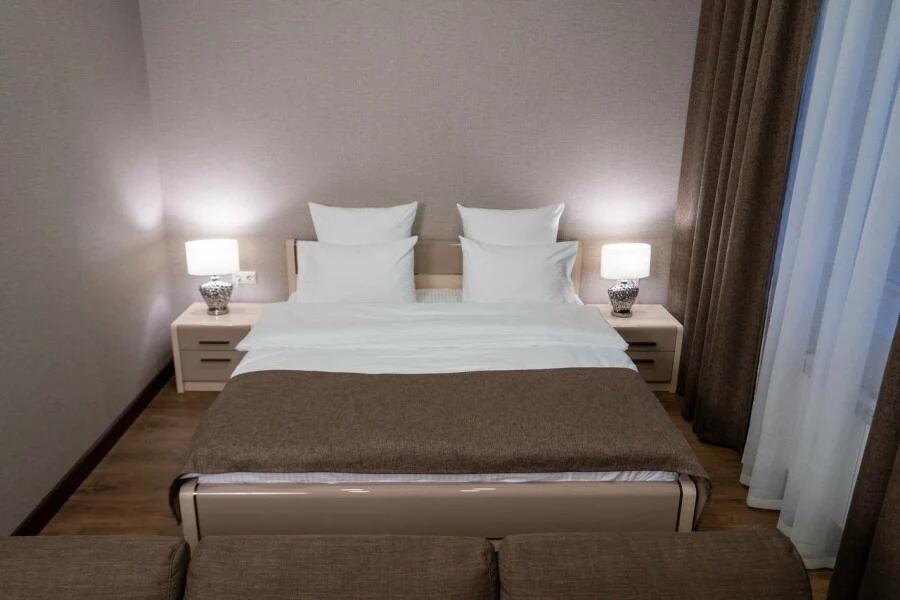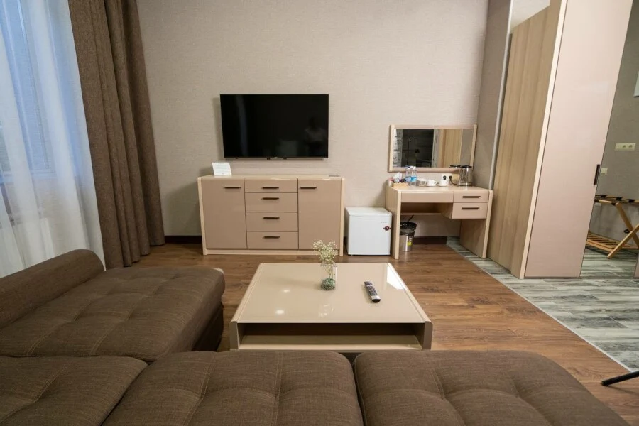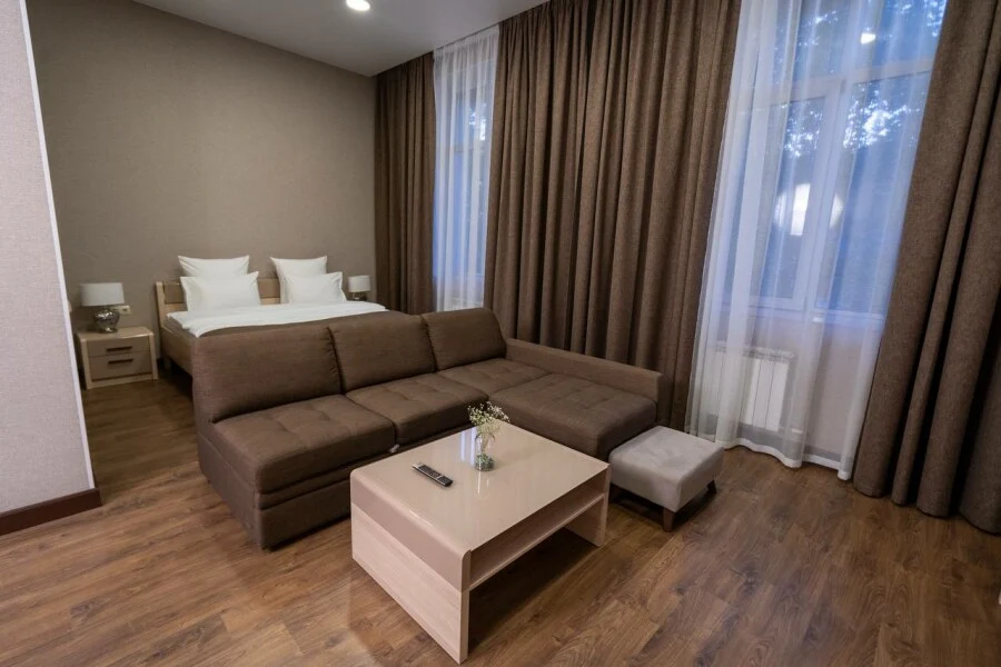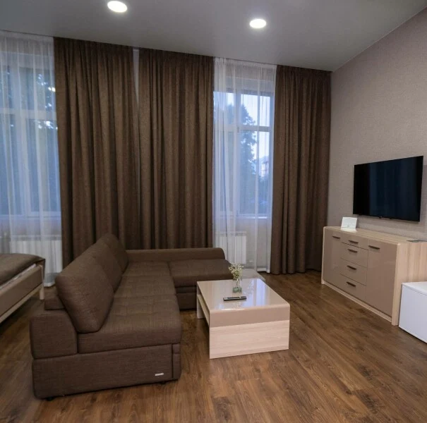 Двуспальная кровать и диван - однокомнатный номер 29,7 кв.м. - личный сан.узел (душевая кабина, раковина, туалет, фен, полотенца для лица и тела, халаты, гигиенические принадлежности, стиральная машина, гладильная доска, утюг, сушилка) - телевизор, чайник, чашки - от 1 до 4х человек - возможно пользование общей кухонной зоной, где есть вся необходимая бытовая техника и посуда