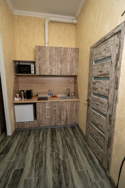 Двуспальная кровать и двуспальный диван - однокомнатный номер 52,8 кв.м. - личный сан.узел (душевая кабина, раковина, туалет, фен, полотенца для лица и тела, халаты, гигиенические принадлежности, стиральная машина, гладильная доска, утюг, сушилка) - кухня (чайник, микроволновка, плита, холодильник, раковина, посуда различного вида) - размещение до 2 человек