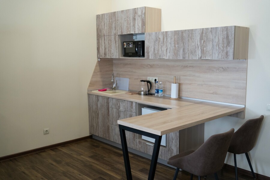 Двухспальная, двухъярусная кровать и диван -двухкомнатный номер с TV 53,2 кв.м -гостиная с кухней, двуспальная кровать и двуспальный диван -спальня с двухъярусной кроватью -личный сан.узел (душевая кабина, раковина, туалет, фен, полотенца для лица и тела, халаты, гигиенические принадлежности, стиральная машина, гладильная доска, утюг, сушилка) - Кухня -раковина, чайник, микроволновка, холодильник, стол, стулья, барная стойка, посуда различного вида -от 1 до 6 человек -дети до 5 лет - бесплатно